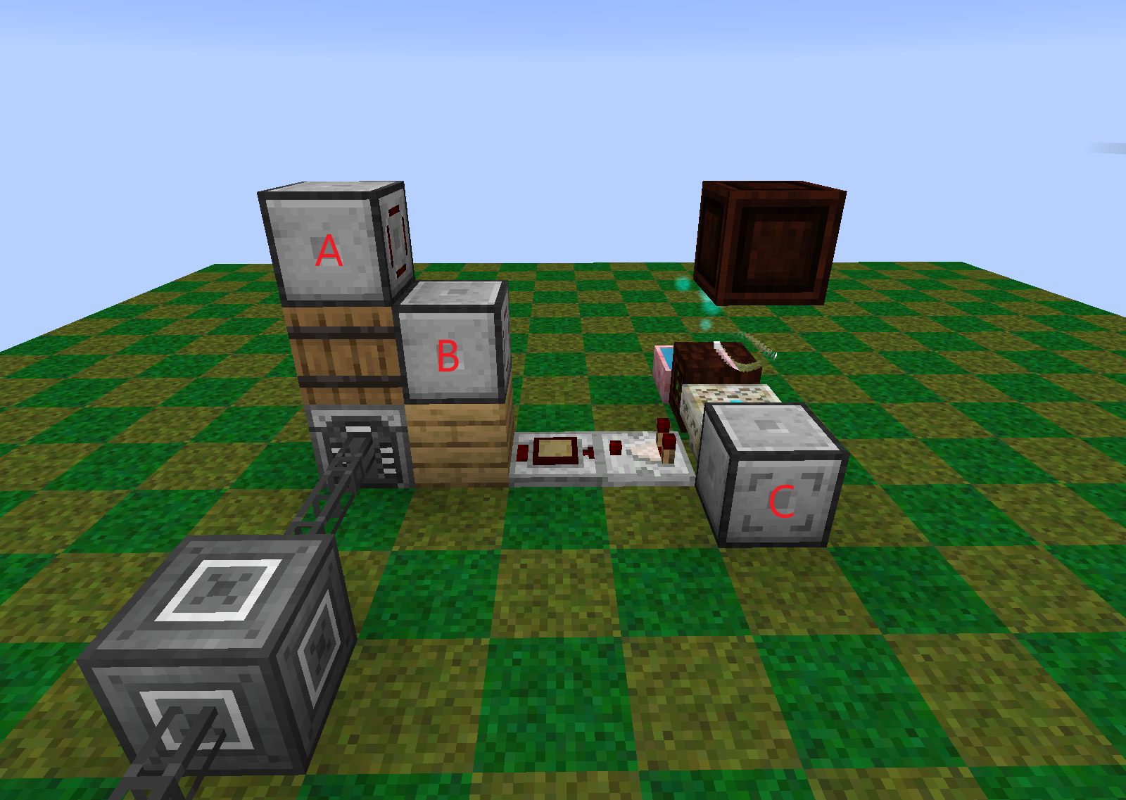 Router A is configured with a Puller Module MK1, set to pull from Down. It also has a Sender Module MK2 which sends over to the Open Crate. Since this is in direct line with the Crate, an MK1 module could be used instead if necessary. This gets our ingredients onto the altar where they'll begin to craft. Since there are no timing circuits, this can take as long as it needs, though it does need to complete before the Living Rock despawns!