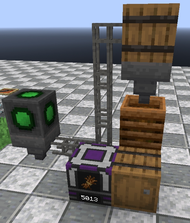 Off to the right is our collecting, processing, and input area. We see the Hopper Enhancement atop a vanilla Hopper. This picks up all items in a radius of about 7 blocks, placing them in the hopper below it; quite sufficient for our needs.