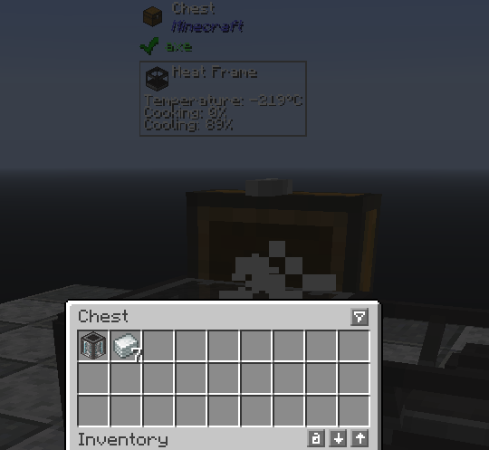 Heat Frames can be installed on most any inventory with a right click. They effectively make that inventory heat sensitive, heating or cooling objects within. When heated, the items are smelted as they would be in a regular furnace. When cooled, however, some real fun begins. A number of fluids can be cooled this way such as Water to Ice, Lava to Obsidian, Molten Plastic to Plastic Sheets, and others that can be seen in JEI by checking the uses of the Heat Frame.