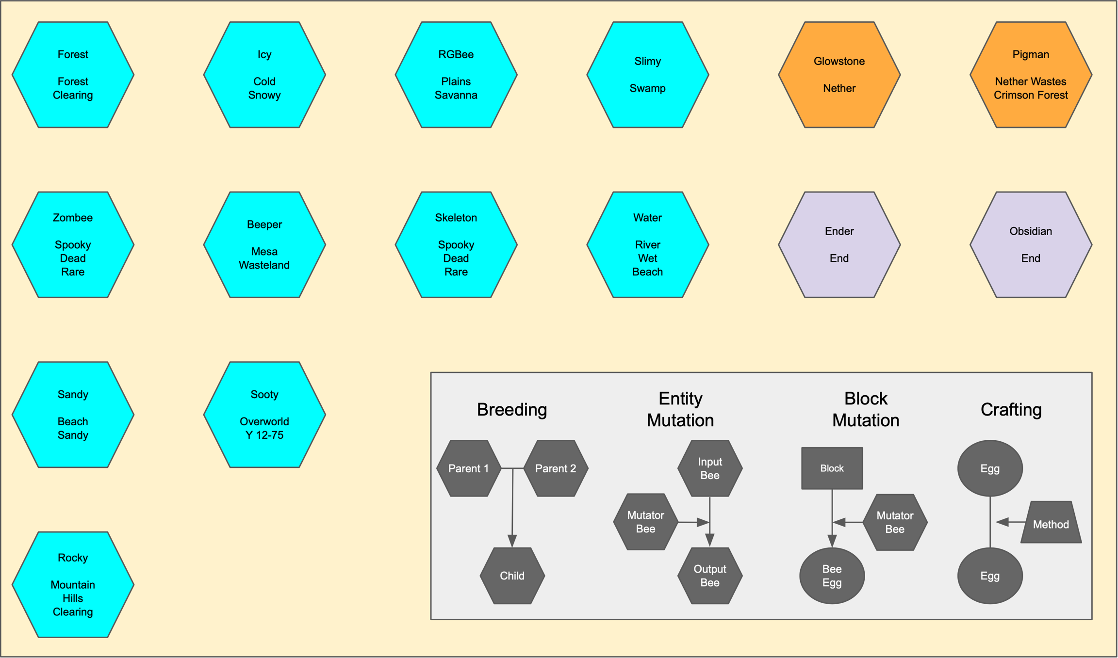 The following graphic shows the bees that naturally spawn in-world, where they spawn, and a key for the breeding/creation of other bees.