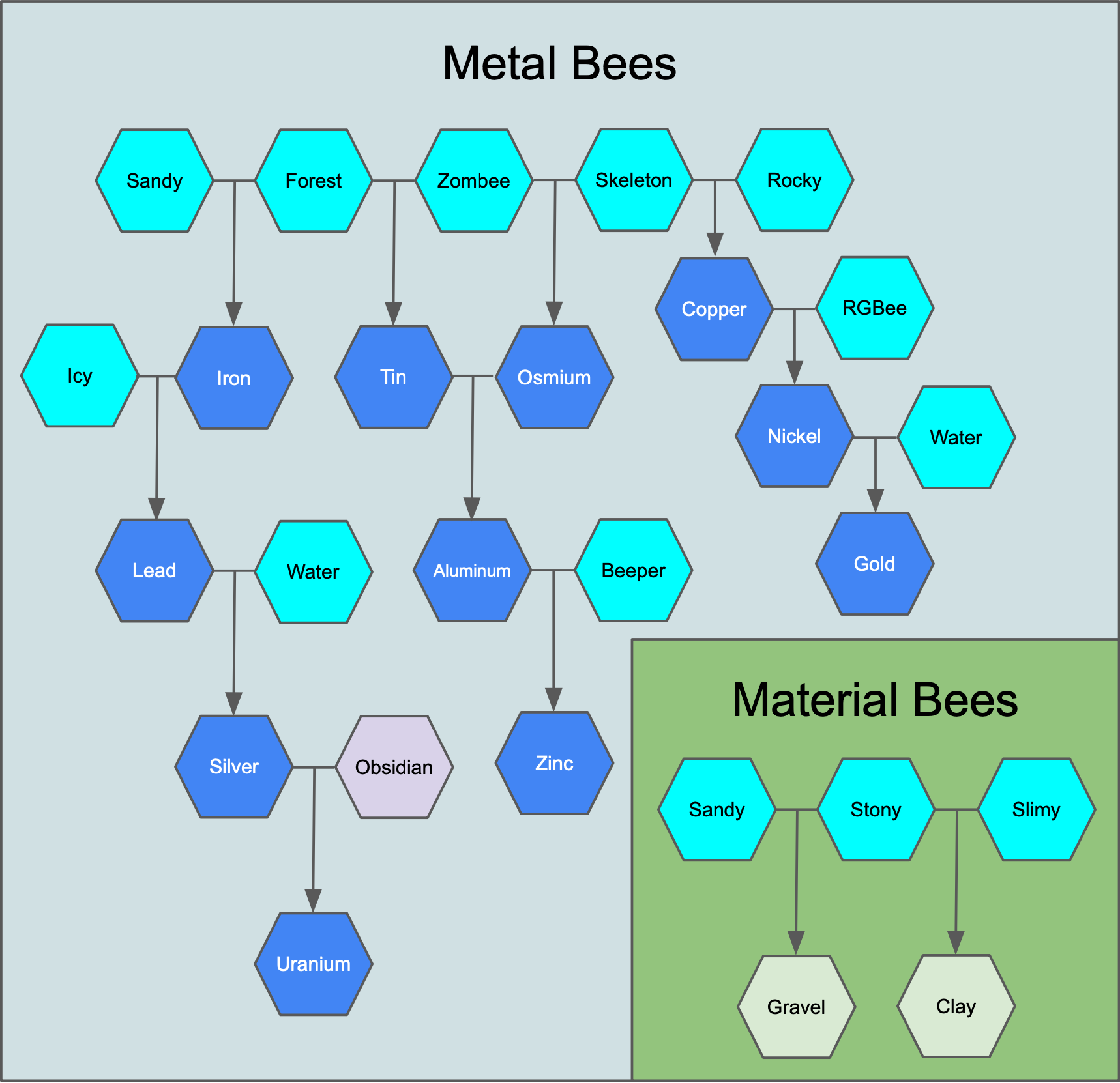 Bees that produce certain materials such as Gravel and Clay as well as various metal ores can be bred via normal crossbreeding. By Right-Clicking the bee with the required material they will breed with each other and produce a child. The exact items for breeding can be seen in the Beepedia or JEI. The graphics below show the results of various crossbreeds, and most bees can be bred with themselves to produce more of the same type.