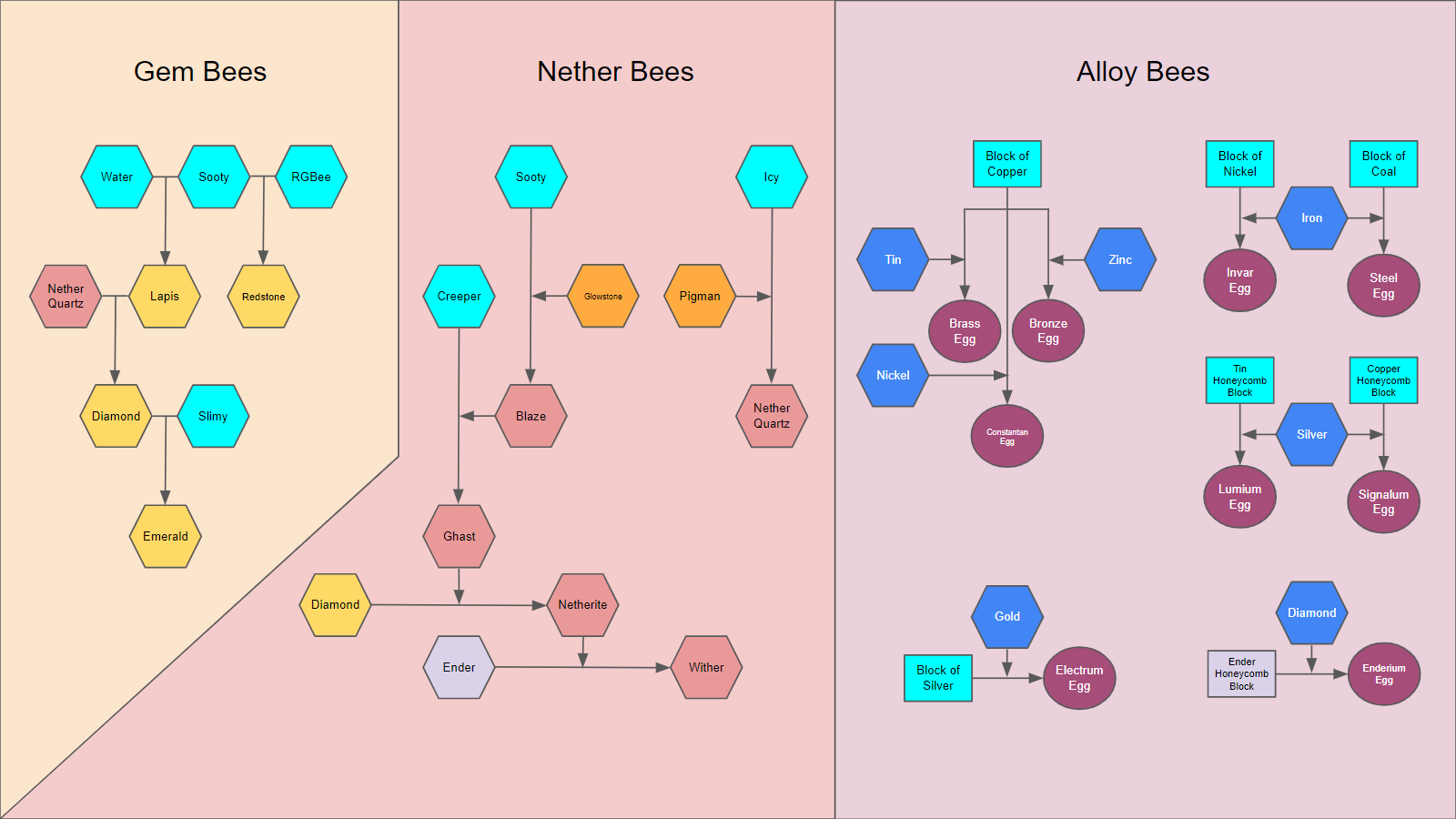 Other bees that are mod-specific are generally produced by using the mod in question - there are currently bees for Botania, Nature’s Aura, Astral Sorcery, Blood Magic, and Tinker’s Construct. The best way to determine how these bees are made is via JEI. Check out recipes for either the spawn egg for the bee, or for Resourceful Bees Glass Jars - different bees are created with both of these methods. The graphic below is NOT all inclusive - as new bees are made they may or may not make it on here in detail.